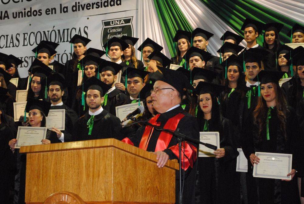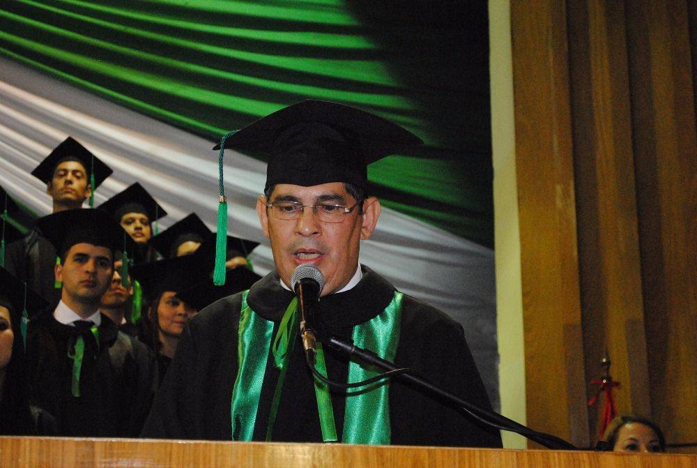 En su discurso, el Decano de la FCE UNA dijo que este año en que la Institución cumple 80 años “reafirmamos el compromiso con la formación de profesionales, con calidad y excelencia educativa, tanto a nivel de grado como postgrado, a fin de que los egresados se inserten en la sociedad como líderes de cambio hacia un nuevo modelo de país progresista y desarrollado, económica y socialmente, que supere la pobreza y la desigualdad entre sus habitantes”.