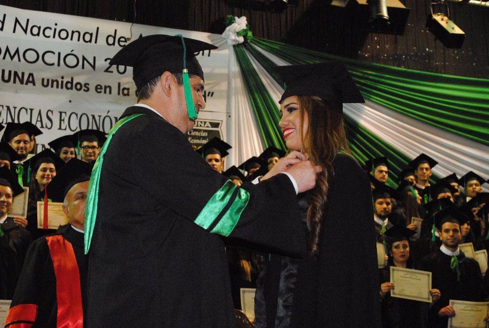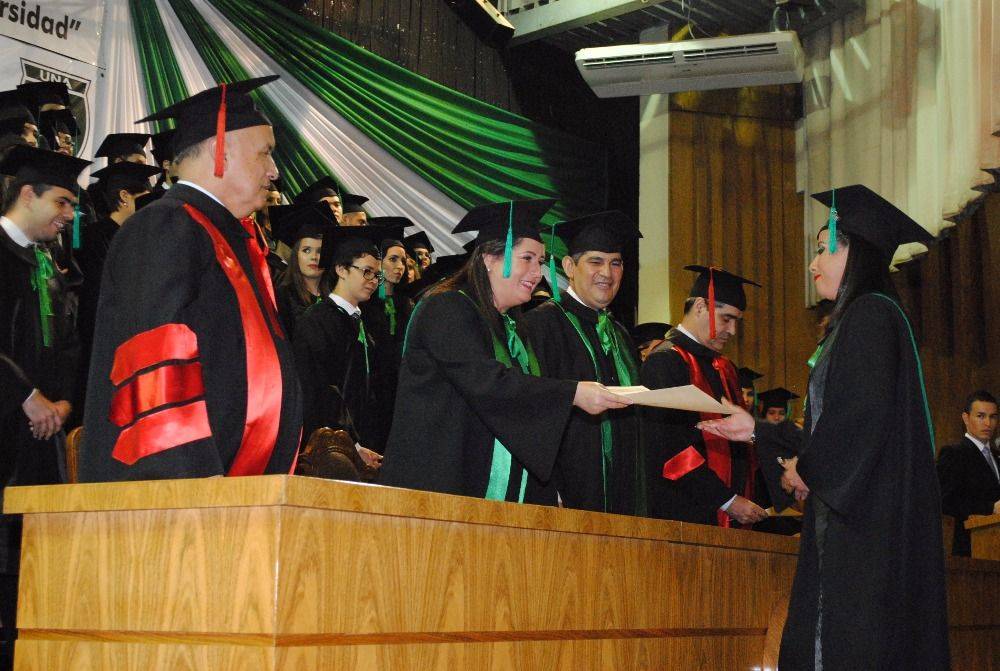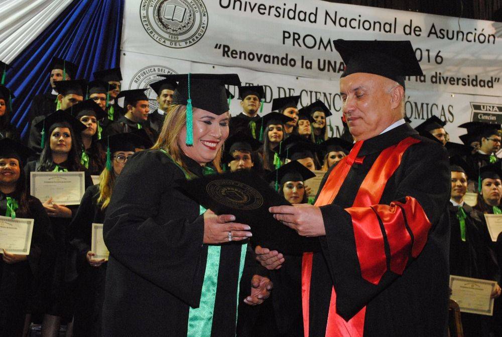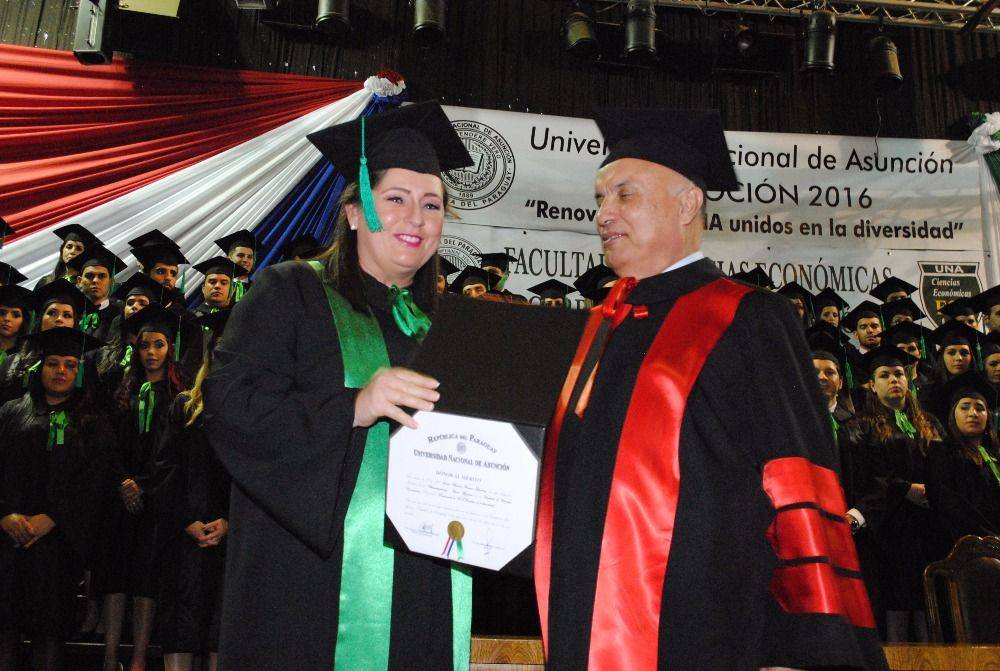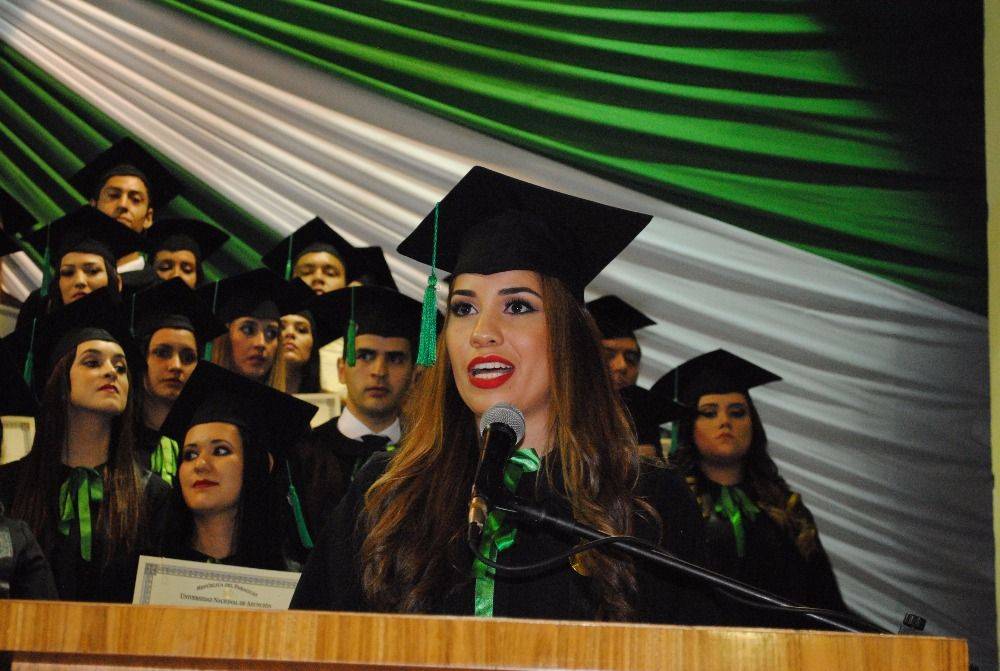 Por su parte, la mejor egresada, Mirtha Elizabeth Sanabria Florentín, se dirigió a sus compañeros en un emotivo discurso en el cual rememoró los momentos vividos durante los años que cursaron la carrera; agradeció a la Facultad de Ciencias Económicas de la UNA por abrirles sus puertas incondicionalmente; a los profesores por ayudarles a ser mejores profesionales, motivándoles a asumir retos cada vez mayores y a trabajar en equipo. Agradeció a sus compañeros con quienes compartió metas, proyectos, logros, fiestas, viajes y experiencias invaluables que los convirtió en una familia.