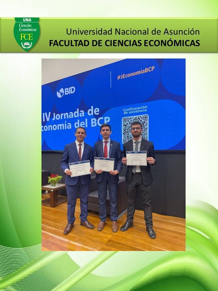 Los universitarios presentaron los siguientes trabajos de investigación, Elasticidad empleo-producto en el sector servicios. Periodo 2018-2023 correspondiente a Fabrizio López y Andrea Román e Intermediación tecnológica y su impacto en las modalidades de trabajo en el sector financiero en Paraguay realizado por Eduardo Esquivel, Antonio Trinidad y Juan Ramón Paredes.