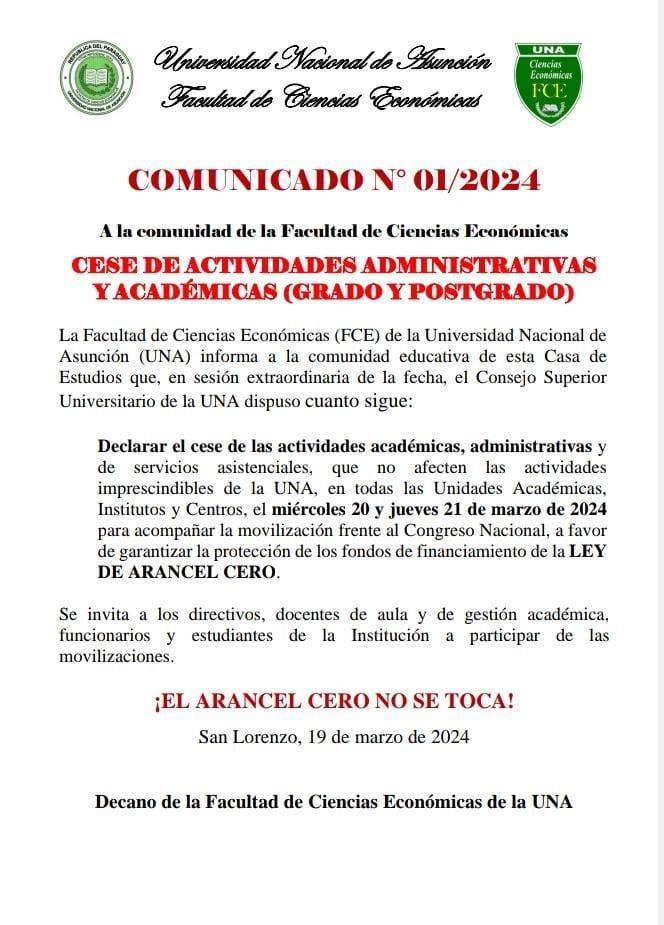 A la comunidad de la Facultad de Ciencias Económicas. Cese de actividades administrativas y académicas (grado y postgrado)