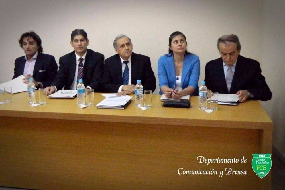 La Mesa Examinadora encabezada por el Prof. Dr. Hugo Franco, Director de Posgrado, con miembros docentes de gran trayectoria de la FCE