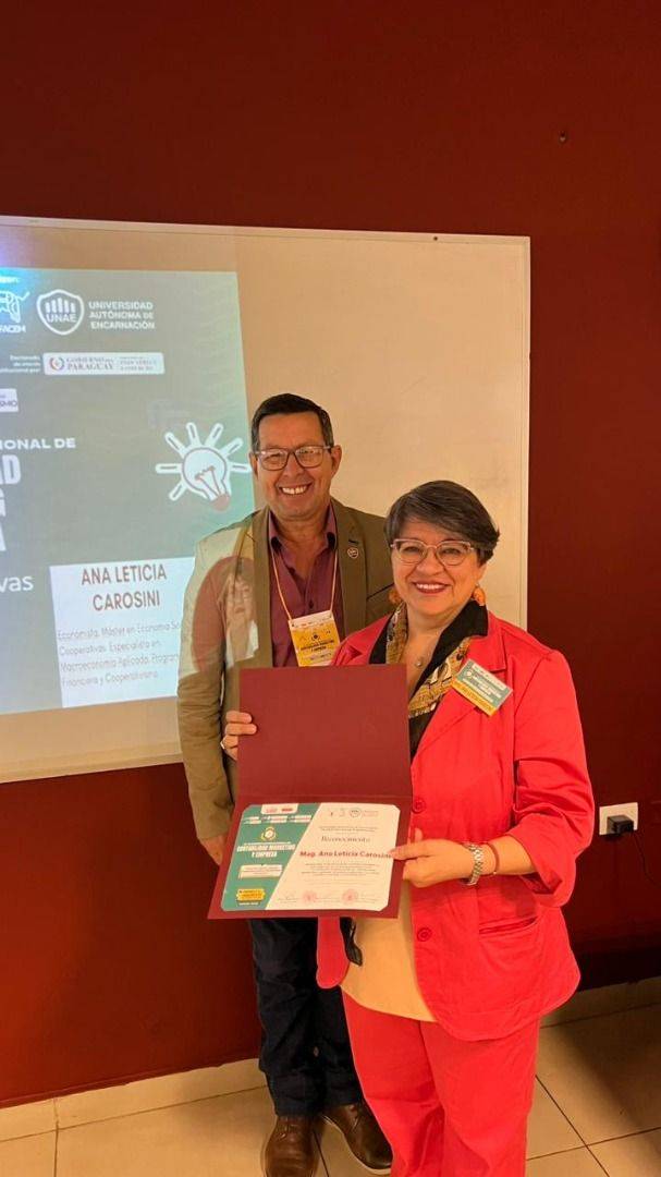 La Docente investigadora de la FCE-UNA. Prof. Ana Leticia Carosini Ruiz-Diaz, ha sido designada a participar en el citado congreso en representación de la FCE-UNA, brindando exposiciones en paneles y workshop sobre temas como “Semblanzas del sector cooperativo paraguayo en los años internacionales cooperativos 2012 y 2025” y también sobre “” Buenas prácticas de alianzas cooperativas para la sostenibilidad de las empresas paraguayas”. La Profesora Carosini ha señalado que su participación en el Congreso ha hecho posible compartir experiencias sobre el sector cooperativo en este Segundo Año Internacional de las Cooperativas 2025, socializando los resultados de las investigaciones llevadas a cabo por la misma, en una línea de investigación innovadora como es la Economía Social y Solidaria. Asimismo, ha permitido fortalecer vínculos académicos con referentes de la pujante región del Departamento de Itapúa, que potenciarán nuevos temas de investigación con miras a visibilizar el aporte de las cooperativas y su impacto positivo en la economía nacional.