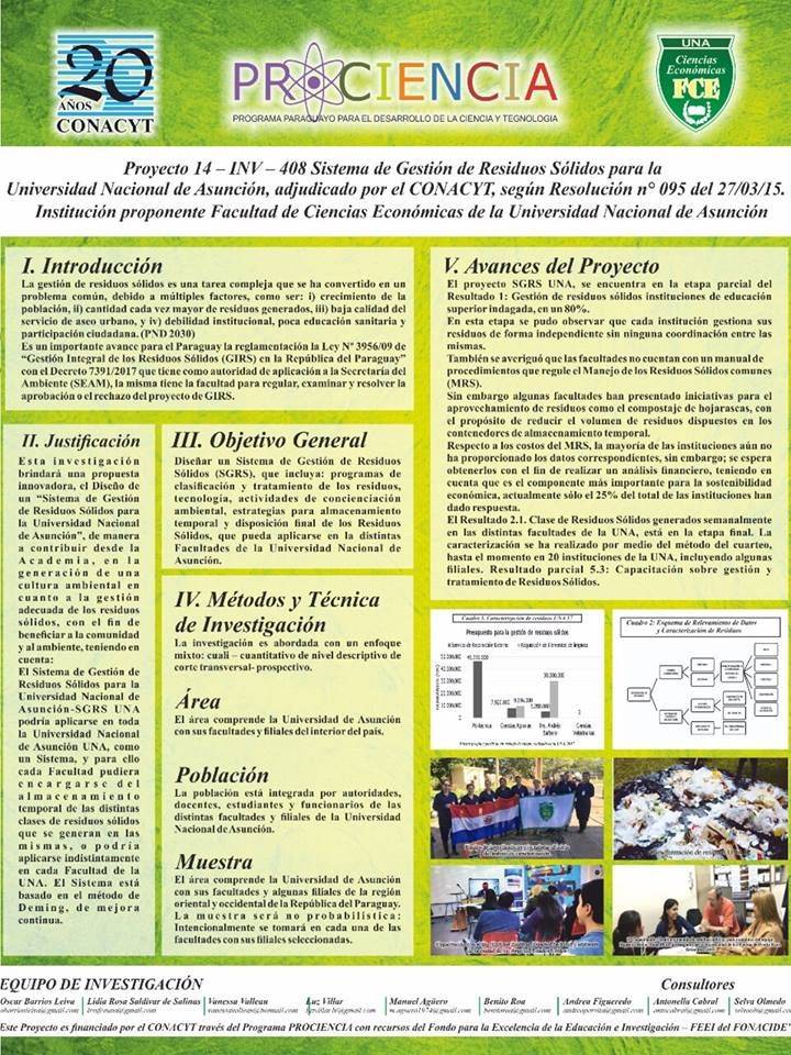 En el marco del II Encuentro de Investigadores. Organizado por la Sociedad Científica del Paraguay se realizó la presentación del avance del proyecto de Sistema de Gestión de Residuos Sólidos para la Universidad Nacional de Asunción. La misma tuvo lugar en dos formatos: primeramente mediante la exposición en poster y luego a través de una presentación oral a cargo del Prof. Econ. Oscar Barrios, Responsable Técnico y la Prof. Mg. Lidia Rosa Saldivar de Salinas, Investigadora Principal. A continuación se mencionan los principales resultados 1, 2, 3 y 5.Avances del Proyecto