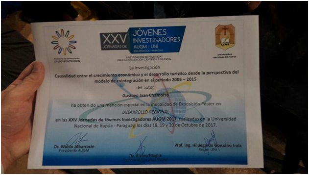Cabe resaltar que el Paraguay tuvo una destacada participación, no solo con la delegación de la UNA sino también los representantes de la Universidad Nacional del Este (UNE) y de la Universidad Nacional de Itapúa (UNI), anfitriona. Se destaca que cada una de las Universidades Públicas obtuvo menciones, tanto en evaluación oral como de poster. Fueron premiados 11 trabajos presentados por la UNA, y una mención especial para la FCE – UNA, con el póster presentado por el Econ. Gustavo Chamorro, egresado de nuestra facultad, con el tema: Causalidad entre el crecimiento económico y el desarrollo turístico desde la perspectiva del modelo de cointegración en el periodo 2005 – 2015.